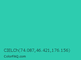 CIELCh 74.087,46.421,176.156 Color is a normal cyan color and the nearest color is Maximum Blue Green #30bfbf. Hex code #2dccaf and RGB value is rgb(45,204,175). In RGB color space, this color is composed of 18% red, 80% green, 69% blue, In CMYK color space, this color is composed of 78% cyan, 0% magenta, 14% yellow , 20% black , In HSL color space, this color has a hue angle of 169° , 64% saturation and 49% lightness.