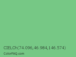 CIELCh 74.096,46.984,146.574 Color is a light green color and the nearest color is De York #7ac488. Hex code #76c885 and RGB value is rgb(118,200,133). In RGB color space, this color is composed of 46% red, 78% green, 52% blue, In CMYK color space, this color is composed of 41% cyan, 0% magenta, 34% yellow , 22% black , In HSL color space, this color has a hue angle of 131° , 43% saturation and 62% lightness.