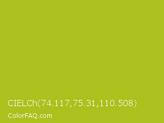 CIELCh 74.117,75.31,110.508 Color is a normal yellow color and the nearest color is Acid Green #b0bf1a. Hex code #abc11d and RGB value is rgb(171,193,29). In RGB color space, this color is composed of 67% red, 76% green, 11% blue, In CMYK color space, this color is composed of 11% cyan, 0% magenta, 85% yellow , 24% black , In HSL color space, this color has a hue angle of 68° , 74% saturation and 44% lightness.