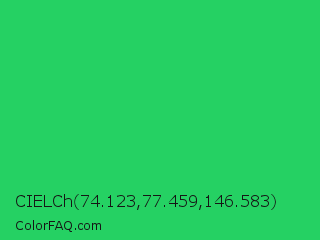 CIELCh 74.123,77.459,146.583 Color is a normal green color and the nearest color is UFO Green #3cd070. Hex code #25d163 and RGB value is rgb(37,209,99). In RGB color space, this color is composed of 15% red, 82% green, 39% blue, In CMYK color space, this color is composed of 82% cyan, 0% magenta, 53% yellow , 18% black , In HSL color space, this color has a hue angle of 142° , 70% saturation and 48% lightness.