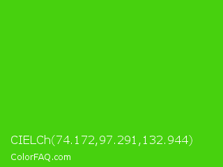 CIELCh 74.172,97.291,132.944 Color is a normal green color and the nearest color is Harlequin Green #46cb18. Hex code #47d10e and RGB value is rgb(71,209,14). In RGB color space, this color is composed of 28% red, 82% green, 5% blue, In CMYK color space, this color is composed of 66% cyan, 0% magenta, 93% yellow , 18% black , In HSL color space, this color has a hue angle of 102° , 87% saturation and 44% lightness.