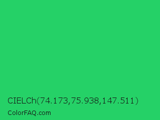 CIELCh 74.173,75.938,147.511 Color is a normal green color and the nearest color is UFO Green #3cd070. Hex code #25d167 and RGB value is rgb(37,209,103). In RGB color space, this color is composed of 15% red, 82% green, 40% blue, In CMYK color space, this color is composed of 82% cyan, 0% magenta, 51% yellow , 18% black , In HSL color space, this color has a hue angle of 143° , 70% saturation and 48% lightness.