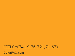 CIELCh 74.19,76.721,71.67 Color is a normal orange color and the nearest color is Tree Poppy #fc9c1d. Hex code #fca321 and RGB value is rgb(252,163,33). In RGB color space, this color is composed of 99% red, 64% green, 13% blue, In CMYK color space, this color is composed of 0% cyan, 35% magenta, 87% yellow , 1% black , In HSL color space, this color has a hue angle of 36° , 97% saturation and 56% lightness.