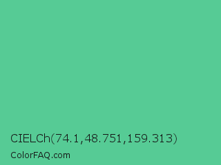 CIELCh 74.1,48.751,159.313 Color is a normal green color and the nearest color is Ocean Green #48bf91. Hex code #56cb95 and RGB value is rgb(86,203,149). In RGB color space, this color is composed of 34% red, 80% green, 58% blue, In CMYK color space, this color is composed of 58% cyan, 0% magenta, 27% yellow , 20% black , In HSL color space, this color has a hue angle of 152° , 53% saturation and 57% lightness.
