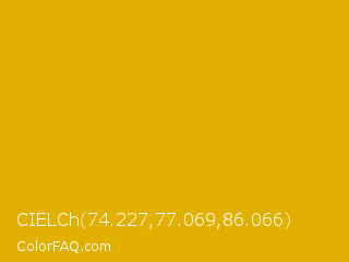 CIELCh 74.227,77.069,86.066 Color is a normal yellow color and the nearest color is Galliano #dcb20c. Hex code #e1b000 and RGB value is rgb(225,176,0). In RGB color space, this color is composed of 88% red, 69% green, 0% blue, In CMYK color space, this color is composed of 0% cyan, 22% magenta, 100% yellow , 12% black , In HSL color space, this color has a hue angle of 47° , 100% saturation and 44% lightness.