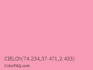 CIELCh 74.234,37.471,2.433 Color is a light rose color and the nearest color is Amaranth Pink #f19cbb. Hex code #f89cb5 and RGB value is rgb(248,156,181). In RGB color space, this color is composed of 97% red, 61% green, 71% blue, In CMYK color space, this color is composed of 0% cyan, 37% magenta, 27% yellow , 3% black , In HSL color space, this color has a hue angle of 344° , 87% saturation and 79% lightness.