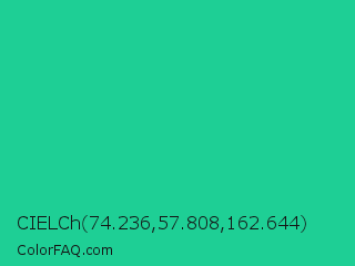 CIELCh 74.236,57.808,162.644 Color is a normal green color and the nearest color is Shamrock #33cc99. Hex code #1ecf95 and RGB value is rgb(30,207,149). In RGB color space, this color is composed of 12% red, 81% green, 58% blue, In CMYK color space, this color is composed of 86% cyan, 0% magenta, 28% yellow , 19% black , In HSL color space, this color has a hue angle of 160° , 75% saturation and 46% lightness.