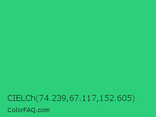 CIELCh 74.239,67.117,152.605 Color is a normal green color and the nearest color is UFO Green #3cd070. Hex code #2cd07b and RGB value is rgb(44,208,123). In RGB color space, this color is composed of 17% red, 82% green, 48% blue, In CMYK color space, this color is composed of 79% cyan, 0% magenta, 41% yellow , 18% black , In HSL color space, this color has a hue angle of 149° , 65% saturation and 49% lightness.
