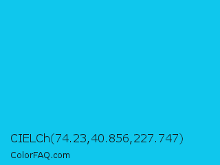 CIELCh 74.23,40.856,227.747 Color is a normal cyan color and the nearest color is Spiro Disco Ball #0fc0fc. Hex code #0fc7ed and RGB value is rgb(15,199,237). In RGB color space, this color is composed of 6% red, 78% green, 93% blue, In CMYK color space, this color is composed of 94% cyan, 16% magenta, 0% yellow , 7% black , In HSL color space, this color has a hue angle of 190° , 88% saturation and 49% lightness.