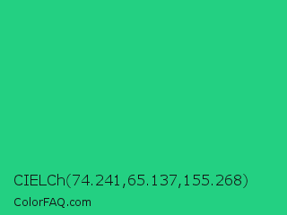 CIELCh 74.241,65.137,155.268 Color is a normal green color and the nearest color is Shamrock #33cc99. Hex code #23d082 and RGB value is rgb(35,208,130). In RGB color space, this color is composed of 14% red, 82% green, 51% blue, In CMYK color space, this color is composed of 83% cyan, 0% magenta, 38% yellow , 18% black , In HSL color space, this color has a hue angle of 153° , 71% saturation and 48% lightness.