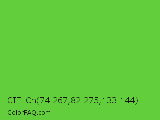 CIELCh 74.267,82.275,133.144 Color is a normal green color and the nearest color is Green RYB #66b032. Hex code #63ce3c and RGB value is rgb(99,206,60). In RGB color space, this color is composed of 39% red, 81% green, 24% blue, In CMYK color space, this color is composed of 52% cyan, 0% magenta, 71% yellow , 19% black , In HSL color space, this color has a hue angle of 104° , 60% saturation and 52% lightness.