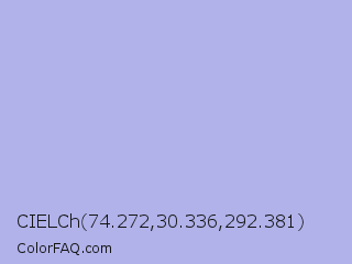 CIELCh 74.272,30.336,292.381 Color is a very light blue color and the nearest color is Maximum Blue Purple #acace6. Hex code #b1b2ea and RGB value is rgb(177,178,234). In RGB color space, this color is composed of 69% red, 70% green, 92% blue, In CMYK color space, this color is composed of 24% cyan, 24% magenta, 0% yellow , 8% black , In HSL color space, this color has a hue angle of 239° , 58% saturation and 81% lightness.