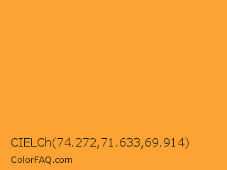 CIELCh 74.272,71.633,69.914 Color is a normal orange color and the nearest color is Sunshade #ff9e2c. Hex code #fca333 and RGB value is rgb(252,163,51). In RGB color space, this color is composed of 99% red, 64% green, 20% blue, In CMYK color space, this color is composed of 0% cyan, 35% magenta, 80% yellow , 1% black , In HSL color space, this color has a hue angle of 33° , 97% saturation and 59% lightness.