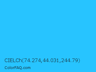 CIELCh 74.274,44.031,244.79 Color is a normal blue color and the nearest color is Spiro Disco Ball #0fc0fc. Hex code #27c4ff and RGB value is rgb(39,196,255). In RGB color space, this color is composed of 15% red, 77% green, 100% blue, In CMYK color space, this color is composed of 85% cyan, 23% magenta, 0% yellow , 0% black , In HSL color space, this color has a hue angle of 196° , 100% saturation and 58% lightness.