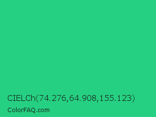 CIELCh 74.276,64.908,155.123 Color is a normal green color and the nearest color is Shamrock #33cc99. Hex code #26d082 and RGB value is rgb(38,208,130). In RGB color space, this color is composed of 15% red, 82% green, 51% blue, In CMYK color space, this color is composed of 82% cyan, 0% magenta, 38% yellow , 18% black , In HSL color space, this color has a hue angle of 152° , 69% saturation and 48% lightness.