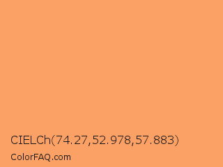 CIELCh 74.27,52.978,57.883 Color is a light orange color and the nearest color is Atomic Tangerine #ff9966. Hex code #fca165 and RGB value is rgb(252,161,101). In RGB color space, this color is composed of 99% red, 63% green, 40% blue, In CMYK color space, this color is composed of 0% cyan, 36% magenta, 60% yellow , 1% black , In HSL color space, this color has a hue angle of 24° , 96% saturation and 69% lightness.