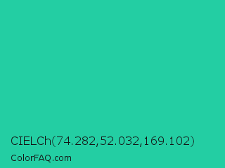 CIELCh 74.282,52.032,169.102 Color is a normal cyan color and the nearest color is Shamrock #33cc99. Hex code #23cea3 and RGB value is rgb(35,206,163). In RGB color space, this color is composed of 14% red, 81% green, 64% blue, In CMYK color space, this color is composed of 83% cyan, 0% magenta, 21% yellow , 19% black , In HSL color space, this color has a hue angle of 165° , 71% saturation and 47% lightness.