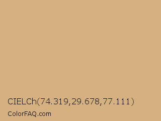 CIELCh 74.319,29.678,77.111 Color is a light orange color and the nearest color is Tan #d2b48c. Hex code #d5b182 and RGB value is rgb(213,177,130). In RGB color space, this color is composed of 84% red, 69% green, 51% blue, In CMYK color space, this color is composed of 0% cyan, 17% magenta, 39% yellow , 16% black , In HSL color space, this color has a hue angle of 34° , 50% saturation and 67% lightness.
