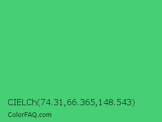 CIELCh 74.31,66.365,148.543 Color is a normal green color and the nearest color is UFO Green #3cd070. Hex code #46cf74 and RGB value is rgb(70,207,116). In RGB color space, this color is composed of 27% red, 81% green, 45% blue, In CMYK color space, this color is composed of 66% cyan, 0% magenta, 44% yellow , 19% black , In HSL color space, this color has a hue angle of 140° , 59% saturation and 54% lightness.