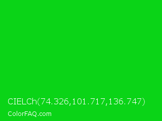 CIELCh 74.326,101.717,136.747 Color is a normal green color and the nearest color is Vivid Malachite #00cc33. Hex code #0ad417 and RGB value is rgb(10,212,23). In RGB color space, this color is composed of 4% red, 83% green, 9% blue, In CMYK color space, this color is composed of 95% cyan, 0% magenta, 89% yellow , 17% black , In HSL color space, this color has a hue angle of 124° , 91% saturation and 44% lightness.