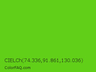 CIELCh 74.336,91.861,130.036 Color is a normal green color and the nearest color is Harlequin Green #46cb18. Hex code #61cf17 and RGB value is rgb(97,207,23). In RGB color space, this color is composed of 38% red, 81% green, 9% blue, In CMYK color space, this color is composed of 53% cyan, 0% magenta, 89% yellow , 19% black , In HSL color space, this color has a hue angle of 96° , 80% saturation and 45% lightness.