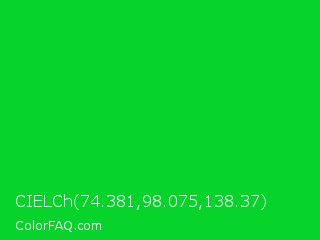 CIELCh 74.381,98.075,138.37 Color is a normal green color and the nearest color is Vivid Malachite #00cc33. Hex code #06d42b and RGB value is rgb(6,212,43). In RGB color space, this color is composed of 2% red, 83% green, 17% blue, In CMYK color space, this color is composed of 97% cyan, 0% magenta, 80% yellow , 17% black , In HSL color space, this color has a hue angle of 131° , 94% saturation and 43% lightness.
