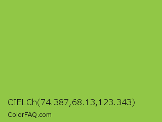 CIELCh 74.387,68.13,123.343 Color is a normal green color and the nearest color is Yellow Green #9acd32. Hex code #91c746 and RGB value is rgb(145,199,70). In RGB color space, this color is composed of 57% red, 78% green, 27% blue, In CMYK color space, this color is composed of 27% cyan, 0% magenta, 65% yellow , 22% black , In HSL color space, this color has a hue angle of 85° , 54% saturation and 53% lightness.