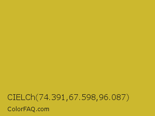 CIELCh 74.391,67.598,96.087 Color is a normal yellow color and the nearest color is Earls Green #c9b93b. Hex code #ccb82e and RGB value is rgb(204,184,46). In RGB color space, this color is composed of 80% red, 72% green, 18% blue, In CMYK color space, this color is composed of 0% cyan, 10% magenta, 77% yellow , 20% black , In HSL color space, this color has a hue angle of 52° , 63% saturation and 49% lightness.