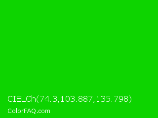 CIELCh 74.3,103.887,135.798 Color is a normal green color and the nearest color is Green #00ff00. Hex code #0dd400 and RGB value is rgb(13,212,0). In RGB color space, this color is composed of 5% red, 83% green, 0% blue, In CMYK color space, this color is composed of 94% cyan, 0% magenta, 100% yellow , 17% black , In HSL color space, this color has a hue angle of 116° , 100% saturation and 42% lightness.