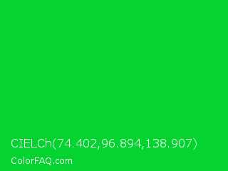 CIELCh 74.402,96.894,138.907 Color is a normal green color and the nearest color is Vivid Malachite #00cc33. Hex code #05d430 and RGB value is rgb(5,212,48). In RGB color space, this color is composed of 2% red, 83% green, 19% blue, In CMYK color space, this color is composed of 98% cyan, 0% magenta, 77% yellow , 17% black , In HSL color space, this color has a hue angle of 132° , 95% saturation and 43% lightness.