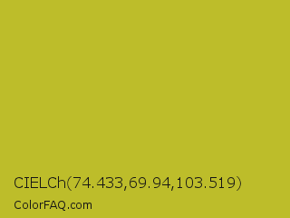 CIELCh 74.433,69.94,103.519 Color is a normal yellow color and the nearest color is Key Lime Pie #bfc921. Hex code #bdbd2a and RGB value is rgb(189,189,42). In RGB color space, this color is composed of 74% red, 74% green, 16% blue, In CMYK color space, this color is composed of 0% cyan, 0% magenta, 78% yellow , 26% black , In HSL color space, this color has a hue angle of 60° , 64% saturation and 45% lightness.