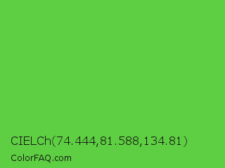 CIELCh 74.444,81.588,134.81 Color is a normal green color and the nearest color is Green RYB #66b032. Hex code #5ecf42 and RGB value is rgb(94,207,66). In RGB color space, this color is composed of 37% red, 81% green, 26% blue, In CMYK color space, this color is composed of 55% cyan, 0% magenta, 68% yellow , 19% black , In HSL color space, this color has a hue angle of 108° , 59% saturation and 54% lightness.
