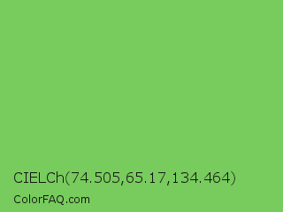 CIELCh 74.505,65.17,134.464 Color is a normal green color and the nearest color is Mantis #74c365. Hex code #78cb5d and RGB value is rgb(120,203,93). In RGB color space, this color is composed of 47% red, 80% green, 36% blue, In CMYK color space, this color is composed of 41% cyan, 0% magenta, 54% yellow , 20% black , In HSL color space, this color has a hue angle of 105° , 51% saturation and 58% lightness.