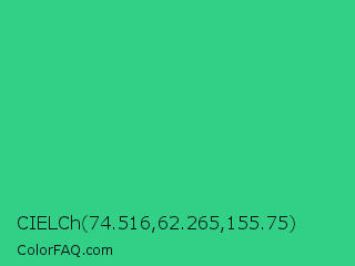 CIELCh 74.516,62.265,155.75 Color is a normal green color and the nearest color is Shamrock #33cc99. Hex code #32d086 and RGB value is rgb(50,208,134). In RGB color space, this color is composed of 20% red, 82% green, 53% blue, In CMYK color space, this color is composed of 76% cyan, 0% magenta, 36% yellow , 18% black , In HSL color space, this color has a hue angle of 152° , 63% saturation and 51% lightness.
