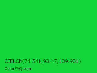 CIELCh 74.541,93.47,139.931 Color is a normal green color and the nearest color is Vivid Malachite #00cc33. Hex code #14d43b and RGB value is rgb(20,212,59). In RGB color space, this color is composed of 8% red, 83% green, 23% blue, In CMYK color space, this color is composed of 91% cyan, 0% magenta, 72% yellow , 17% black , In HSL color space, this color has a hue angle of 132° , 83% saturation and 45% lightness.
