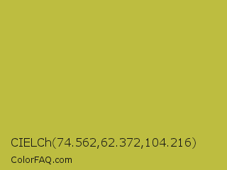 CIELCh 74.562,62.372,104.216 Color is a normal yellow color and the nearest color is Earls Green #c9b93b. Hex code #bdbd40 and RGB value is rgb(189,189,64). In RGB color space, this color is composed of 74% red, 74% green, 25% blue, In CMYK color space, this color is composed of 0% cyan, 0% magenta, 66% yellow , 26% black , In HSL color space, this color has a hue angle of 60° , 49% saturation and 50% lightness.