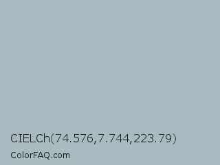 CIELCh 74.576,7.744,223.79 Color is a light blue color and the nearest color is Tower Gray #a9bdbf. Hex code #a7bbc1 and RGB value is rgb(167,187,193). In RGB color space, this color is composed of 65% red, 73% green, 76% blue, In CMYK color space, this color is composed of 13% cyan, 3% magenta, 0% yellow , 24% black , In HSL color space, this color has a hue angle of 194° , 17% saturation and 71% lightness.