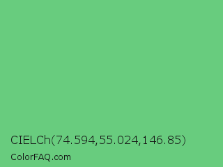 CIELCh 74.594,55.024,146.85 Color is a normal green color and the nearest color is Iguana Green #71bc78. Hex code #68cc7e and RGB value is rgb(104,204,126). In RGB color space, this color is composed of 41% red, 80% green, 49% blue, In CMYK color space, this color is composed of 49% cyan, 0% magenta, 38% yellow , 20% black , In HSL color space, this color has a hue angle of 133° , 50% saturation and 60% lightness.