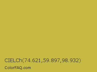 CIELCh 74.621,59.897,98.932 Color is a normal yellow color and the nearest color is Turmeric #cabb48. Hex code #c7ba44 and RGB value is rgb(199,186,68). In RGB color space, this color is composed of 78% red, 73% green, 27% blue, In CMYK color space, this color is composed of 0% cyan, 7% magenta, 66% yellow , 22% black , In HSL color space, this color has a hue angle of 54° , 54% saturation and 52% lightness.