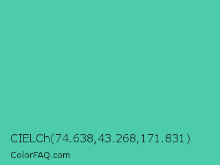 CIELCh 74.638,43.268,171.831 Color is a normal cyan color and the nearest color is Eucalyptus #44d7a8. Hex code #4dccab and RGB value is rgb(77,204,171). In RGB color space, this color is composed of 30% red, 80% green, 67% blue, In CMYK color space, this color is composed of 62% cyan, 0% magenta, 16% yellow , 20% black , In HSL color space, this color has a hue angle of 164° , 55% saturation and 55% lightness.