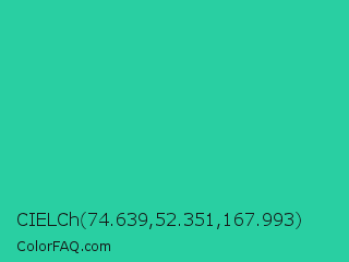 CIELCh 74.639,52.351,167.993 Color is a normal cyan color and the nearest color is Shamrock #33cc99. Hex code #29cfa2 and RGB value is rgb(41,207,162). In RGB color space, this color is composed of 16% red, 81% green, 64% blue, In CMYK color space, this color is composed of 80% cyan, 0% magenta, 22% yellow , 19% black , In HSL color space, this color has a hue angle of 164° , 67% saturation and 49% lightness.