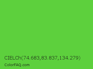 CIELCh 74.683,83.837,134.279 Color is a normal green color and the nearest color is Green RYB #66b032. Hex code #5dd03d and RGB value is rgb(93,208,61). In RGB color space, this color is composed of 36% red, 82% green, 24% blue, In CMYK color space, this color is composed of 55% cyan, 0% magenta, 71% yellow , 18% black , In HSL color space, this color has a hue angle of 107° , 61% saturation and 53% lightness.