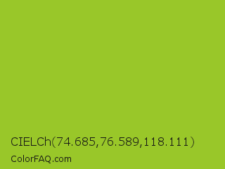 CIELCh 74.685,76.589,118.111 Color is a normal lime color and the nearest color is Atlantis #97cd2d. Hex code #99c729 and RGB value is rgb(153,199,41). In RGB color space, this color is composed of 60% red, 78% green, 16% blue, In CMYK color space, this color is composed of 23% cyan, 0% magenta, 79% yellow , 22% black , In HSL color space, this color has a hue angle of 77° , 66% saturation and 47% lightness.