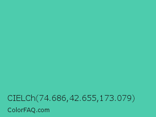 CIELCh 74.686,42.655,173.079 Color is a normal cyan color and the nearest color is Eucalyptus #44d7a8. Hex code #4dccad and RGB value is rgb(77,204,173). In RGB color space, this color is composed of 30% red, 80% green, 68% blue, In CMYK color space, this color is composed of 62% cyan, 0% magenta, 15% yellow , 20% black , In HSL color space, this color has a hue angle of 165° , 55% saturation and 55% lightness.