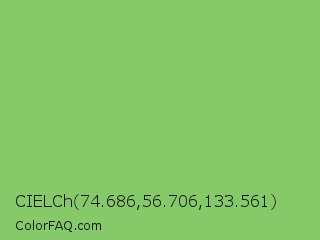CIELCh 74.686,56.706,133.561 Color is a normal green color and the nearest color is Dollar Bill #85bb65. Hex code #85c969 and RGB value is rgb(133,201,105). In RGB color space, this color is composed of 52% red, 79% green, 41% blue, In CMYK color space, this color is composed of 34% cyan, 0% magenta, 48% yellow , 21% black , In HSL color space, this color has a hue angle of 103° , 47% saturation and 60% lightness.