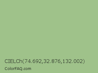 CIELCh 74.692,32.876,132.002 Color is a light green color and the nearest color is Swamp Green #acb78e. Hex code #9fc28a and RGB value is rgb(159,194,138). In RGB color space, this color is composed of 62% red, 76% green, 54% blue, In CMYK color space, this color is composed of 18% cyan, 0% magenta, 29% yellow , 24% black , In HSL color space, this color has a hue angle of 98° , 31% saturation and 65% lightness.