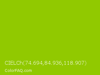 CIELCh 74.694,84.936,118.907 Color is a normal lime color and the nearest color is Sheen Green #8fd400. Hex code #91c900 and RGB value is rgb(145,201,0). In RGB color space, this color is composed of 57% red, 79% green, 0% blue, In CMYK color space, this color is composed of 28% cyan, 0% magenta, 100% yellow , 21% black , In HSL color space, this color has a hue angle of 77° , 100% saturation and 39% lightness.