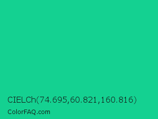 CIELCh 74.695,60.821,160.816 Color is a normal green color and the nearest color is Caribbean Green #00cc99. Hex code #14d191 and RGB value is rgb(20,209,145). In RGB color space, this color is composed of 8% red, 82% green, 57% blue, In CMYK color space, this color is composed of 90% cyan, 0% magenta, 31% yellow , 18% black , In HSL color space, this color has a hue angle of 160° , 83% saturation and 45% lightness.