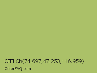 CIELCh 74.697,47.253,116.959 Color is a normal lime color and the nearest color is Middle Green Yellow #acbf60. Hex code #abc168 and RGB value is rgb(171,193,104). In RGB color space, this color is composed of 67% red, 76% green, 41% blue, In CMYK color space, this color is composed of 11% cyan, 0% magenta, 46% yellow , 24% black , In HSL color space, this color has a hue angle of 75° , 42% saturation and 58% lightness.