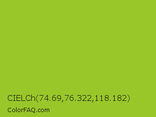 CIELCh 74.69,76.322,118.182 Color is a normal lime color and the nearest color is Atlantis #97cd2d. Hex code #99c72a and RGB value is rgb(153,199,42). In RGB color space, this color is composed of 60% red, 78% green, 16% blue, In CMYK color space, this color is composed of 23% cyan, 0% magenta, 79% yellow , 22% black , In HSL color space, this color has a hue angle of 78° , 65% saturation and 47% lightness.